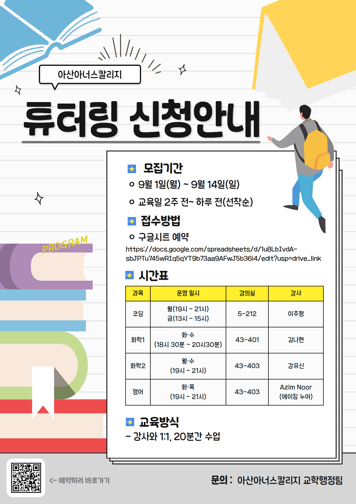 2025-2학기 RC프로그램 튜터링 신청 안내 신청 링크: https://docs.google.com/spreadsheets/d/1u8LbIvdA-sbJPTu745wRIq5qYT9b73aa9AFwJ5b36i4/edit? 신청 기간: 9.1(월) ~ 9.14(일) *선착순 모집* 1. 목적 - 교과과정의 부족한 부분 보충 2. 신청 기간: 2025.9.1(월) ~ 9.14(일) / 교육일 2주 전 ~ 하루 전(선착순) 3. 교육 기간: 2025. 9. 15.(월) ~ 12. 5.(금) / 주 2회 2시간씩 총 10주 4. 장소: 코딩(5-212) / 화학1(43-401) / 화학2(43-403) / 영어(43-403) 5. 참여 대상: 아산아너스칼리지 재학생 6. 교육 방식: 1:1 교육(인당 20분) 7. 신청 방법: 신청 링크 접속 -> 원하는 과목, 요일, 시간에 해당하는 칸에 학번과 이름 작성 |