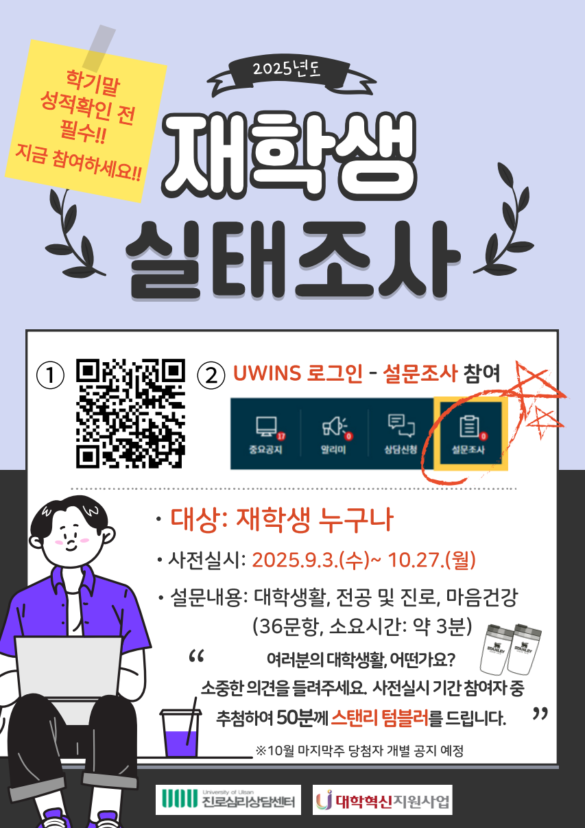 진로심리상담센터에서 본교 재학생의 대학생활 및 진로 적응 지원과 재학생 특성연구를 위하여 '2025학년도 재학생 실태조사'를 아래와 같이 진행하고자 합니다. 1. 주제: 2025학년도 재학생 실태조사 2. 대상: 본 대학 학부 재학생 3. 사전실시기간: 2025. 9. 3.(수) ~ 10. 27.(월) 4. 설문내용: 학교생활, 전공 선택 및 취업 및 진로, 마음건강 관련 설문(총 36문항, 소요시간 3분) 5. 실시방법: UWINS 로그인→ "설문조사" 선택→ "신입생/재학생 실태조사" 실시 6. 기타사항 가. 2학기 말 성적 확인 전 필수로 실시 나. 사전 실시 참여자 중 정서·진로 적응 위기군 선별, 지원 프로그램 안내 및 제공 다. 사전 실시 참여자 중 추첨하여 "기념품" 증정 7. 문의: 진로심리상담센터 전임상담원 전미경(mkjeon@ulsan.ac.kr, 2644)
