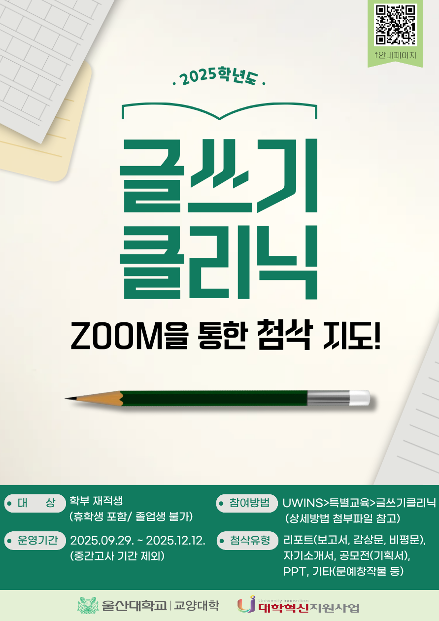 울산대학교 교양대학에서 학생들의 의사소통 역량 강화와 다양한 형태의 글쓰기 지도에 대한 수요 해소를 위해 '글쓰기 클리닉'을 실시하고자 합니다. 가. 대상 : 학부 재적생(휴학생 포함 / 졸업생 불가) 나. 운영기간 : 2025.9.29(월) ~ 12.12(금) 다. 신청방법 : UWINS > 특별교육 > 글쓰기 클리닉 라. 운영방법 : ZOOM을 통한 온라인 1대1 첨삭지도 마. 첨삭대상 : 리포트(보고서, 감상문, 비평문), 자기소개서, 공모전(기획서), PPT(내용과 구성), 기타(문예창작물 등) |