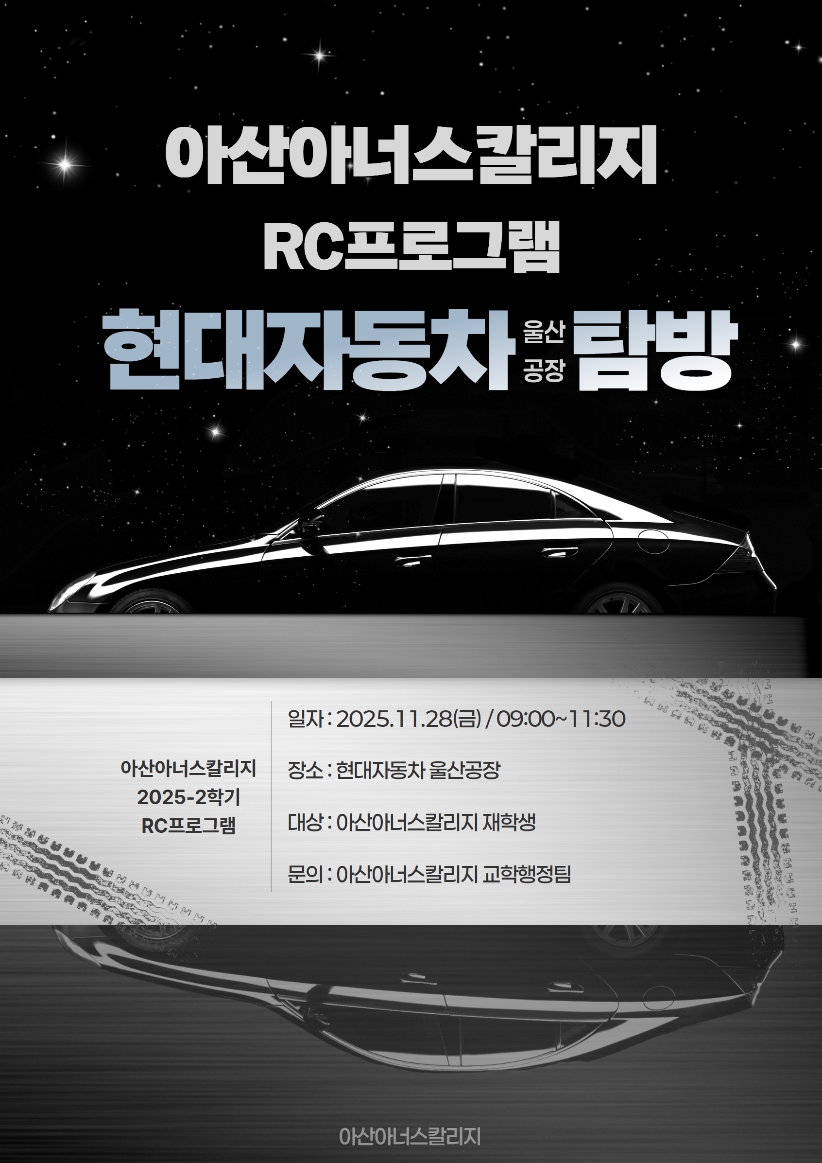아산아너스칼리지 2025-2학기 RC프로그램 '현대자동차 울산공장 탐방' 1. 내용 : 현대자동차 울산공장 역사 설명 및 올드카 전시 관람 공장 라인 관람 및 자동차 생산 공정 설명 공장 내 자동차 전용부두 설명 2. 일시 : 2025.11.28(금) 12:00~15:20 09:00~11:30 3. 장소 : 현대자동차 울산공장 4. 참여 대상 : 아산아너스칼리지 재학생 신청 링크 : https://ustar.ulsan.ac.kr/ko/program/ALL/view/2947 사전 수요 조사에서 참석을 희망한 학생들은 위의 링크를 통해 신청해주시기 바랍니다.