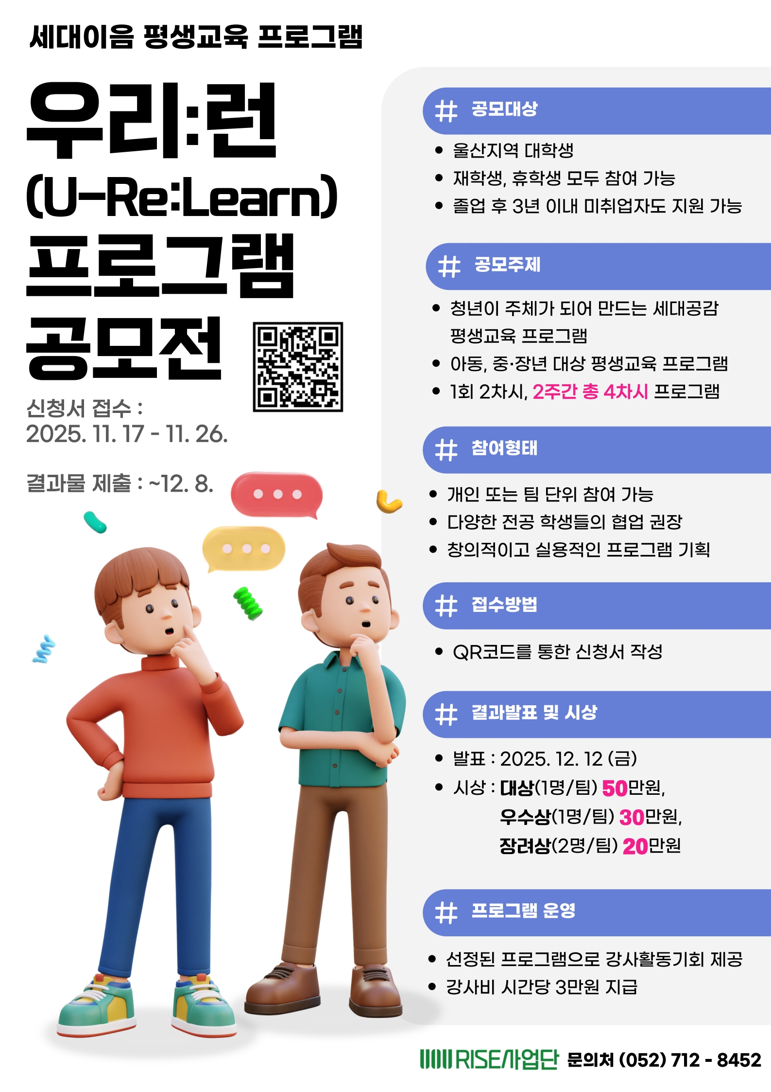 RISE사업단에서 우리런(U-Re:Learn) 프로그램 공모전을 진행합니다. "“여러분의 아이디어가 진짜 프로그램이 됩니다!”