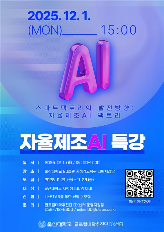 ▶ 일시: 25. 12. 1.(월) 오후 3~5시 ▶ 장소: 시청각교육관(20호관) 다매체강당 *장소 변경 시 안내 예정 ▶ 대상: 울산대학교 재학생 ▶ 준비물: 필기도구