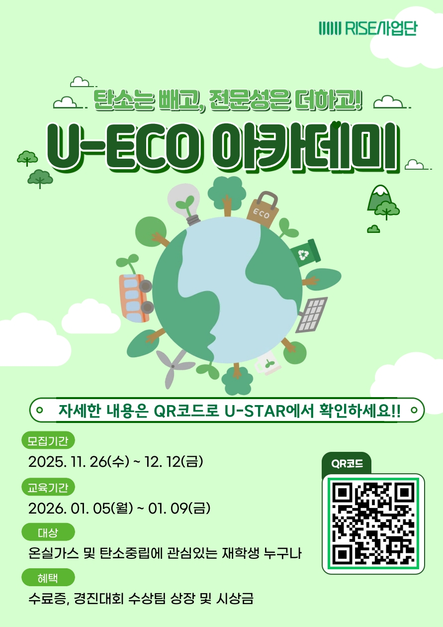 울산대학교 RISE사업단 기업지원R&D센터에서 아래와 같이 2025학년도 U-ECO 아카데미 참여학생을 모집하오니 관심 있는 학생들은 참여 바랍니다. 가. 사업명: 2025학년도 U-ECO 아카데미 나. 참여대상: 울산대학교 재학생(전 학부) 다. 모집인원: 40여명 라. 교육기간: 2026년 01월 05일(월) ~ 2026년 01월 09일(금) 마. 모집기간: 2025년 11월 26일(수) ~ 12월 12일(금) 바. 신청방법: U-STAR를 통한 신청 사. 문의처 - RISE사업단 기업지원R&D센터 윤순영 연구원(052-259-1941)